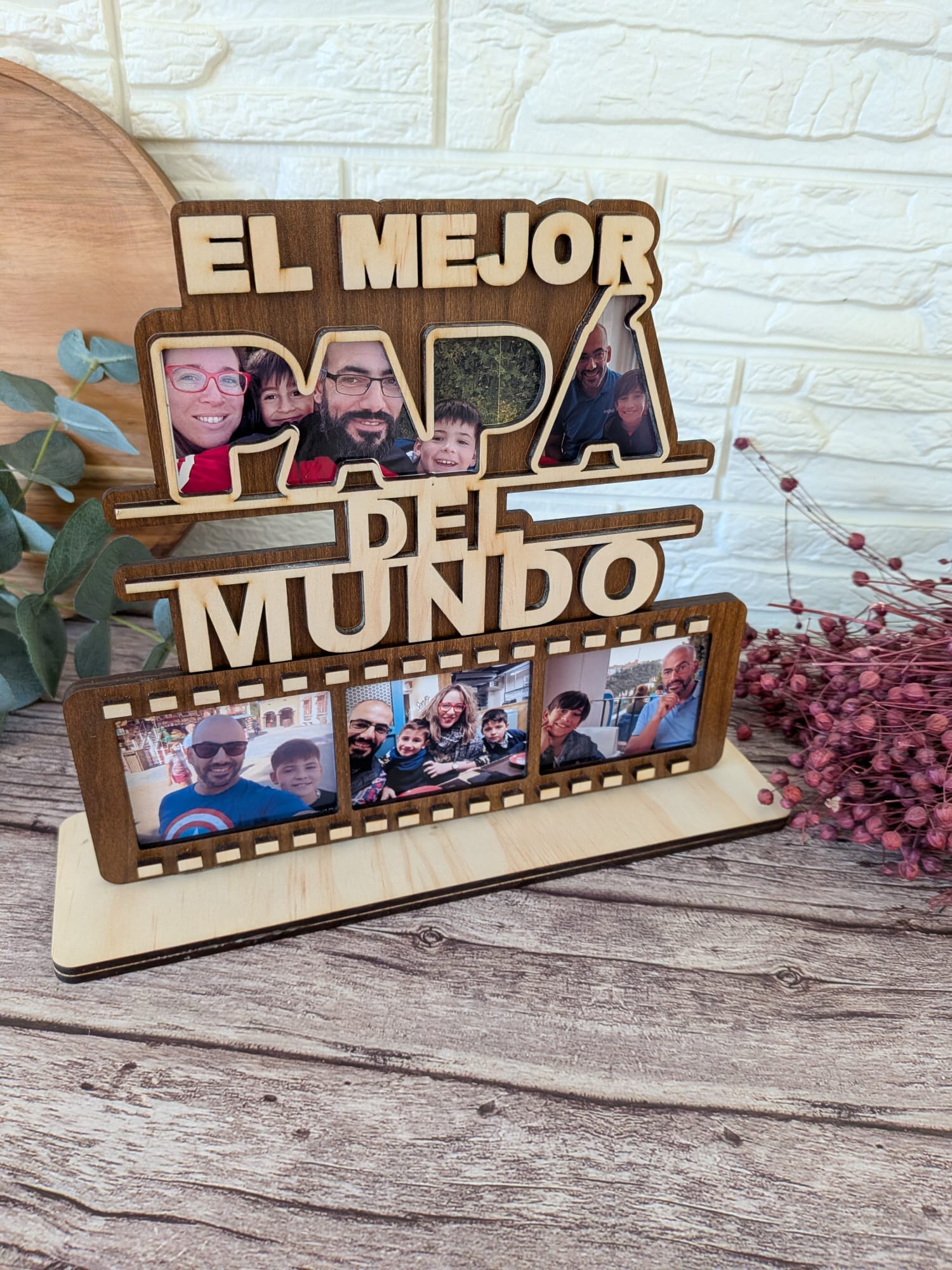 Un regalo original para los papás amantes del cine. Este adorno con temática cinematográfica combina diseño creativo y emoción, incorporando la frase “El mejor papá del mundo” junto a varias fotos personalizadas que capturan momentos inolvidables. Su estilo inspirado en el séptimo arte lo convierte en una pieza decorativa única, perfecta para sorprender a Papá con un detalle que celebra sus mejores escenas en familia.