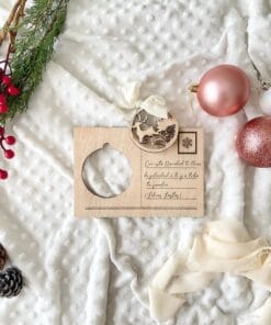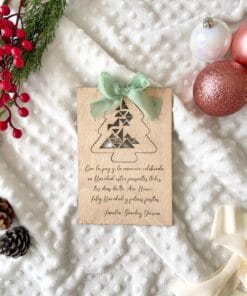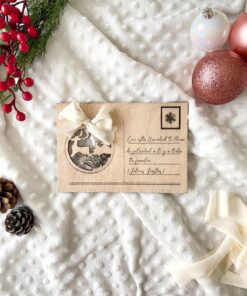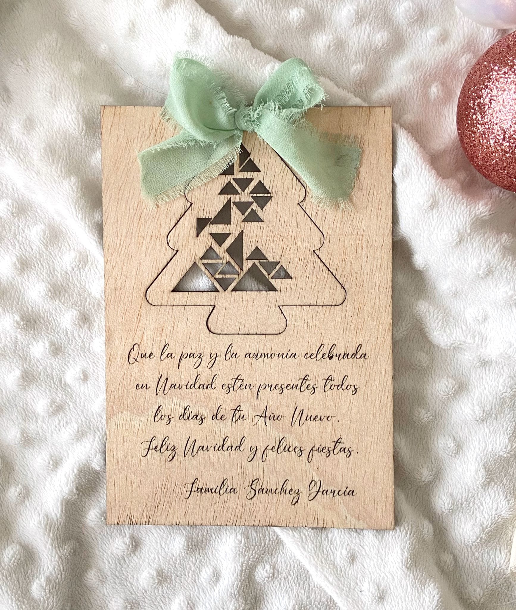 Cada tarjeta contiene una inscripción personalizada y adorno de navidad que se puede colgar en un árbol de Navidad.
