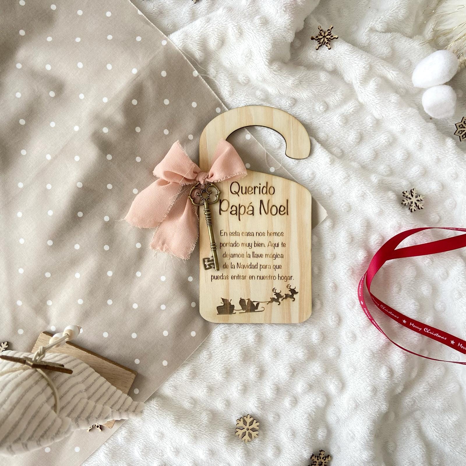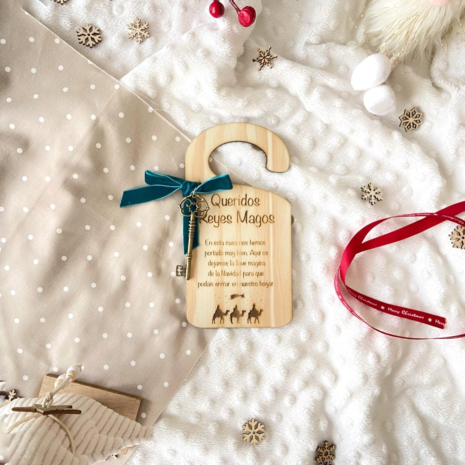 ¿Tu casa no tiene chimenea? ¡No hay problema! Este encantador colgador de puerta viene con una llave mágica que permite a los Reyes Magos o a Papá Noel entrar silenciosamente y dejar los regalos sin ser vistos. Solo cuélgalo en la puerta la noche especial y deja que la magia haga su trabajo. Ideal para mantener viva la ilusión y la fantasía en los más pequeños.