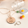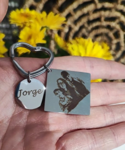Llavero con forma de corazon con medalla redonda y placa en forma de rombo donde podrás llevar a tus seres queridos.