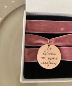 Meda lla de acero inoxidable de 4 cm de diámetro grabada a laser con cinta de terciopelo de1,5cm de ancho y 60 cm de largo.