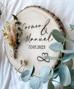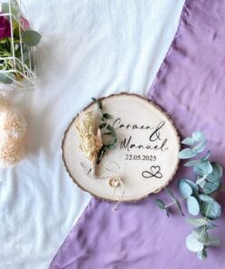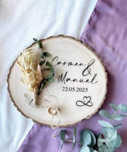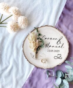 Descubre nuestro Porta Alianzas Natural: Un hermoso y único porta alianzas hecho de una rodaja de madera, adornado con delicadas flores preservadas. Este encantador accesorio no solo es funcional, sino que también añade un toque rústico y romántico a tu ceremonia. Personaliza tu porta alianzas grabando los nombres de los novios y cualquier mensaje especial que desees. Ideal para capturar la esencia de tu amor y hacer de tu día especial un recuerdo inolvidable. ¡Haz que tu boda sea aún más mágica con este detalle único!