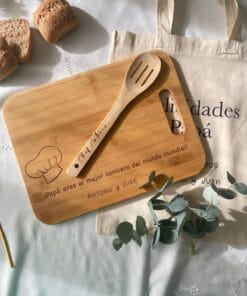 Descubre nuestra encantadora tabla de cortar de madera, perfecta para añadir un toque personal a tu cocina. Cada tabla viene grabada con una frase personalizada que la convierte en un regalo único y significativo. Además, incluimos un hermoso cucharón de madera, ideal para tus preparaciones culinarias. Todo esto se presenta en una elegante bolsa de lino, adornada con una frase especial que hará que cada uso sea aún más memorable. ¡Haz de cada comida una celebración con este set exclusivo!